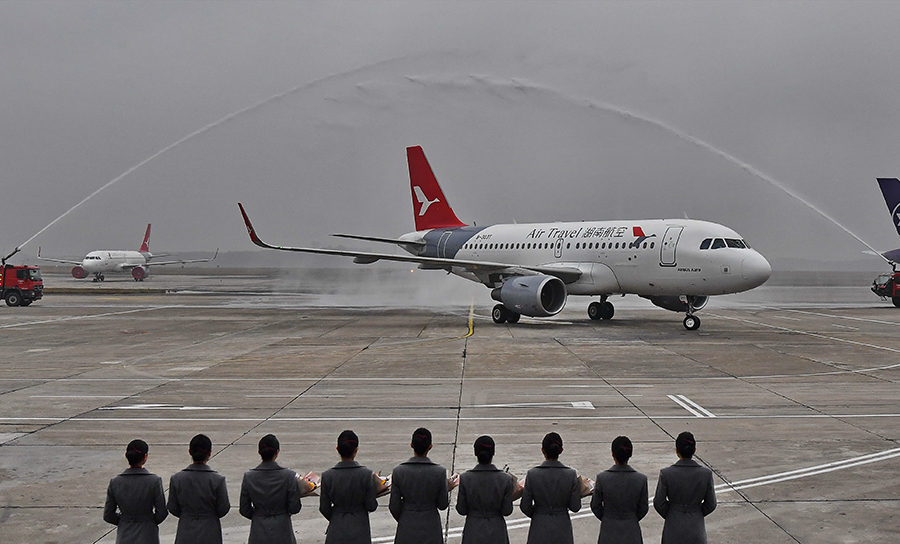 12月8日9时28分,首架机身喷涂“湖南航空”的空客A319客机,飞抵长沙黄花国际机场并接受“过水门”礼仪。 湖南日报记者 童迪 摄