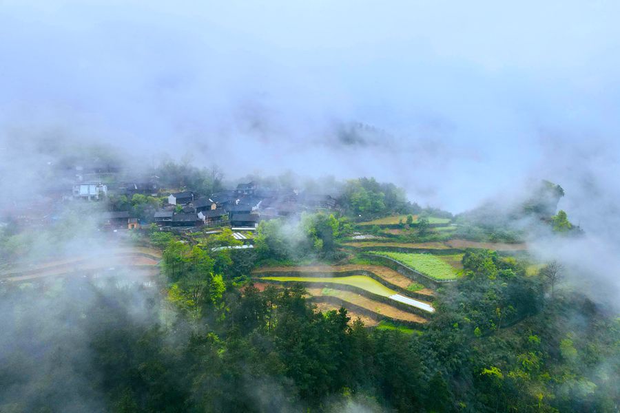 4月20日,吉首市矮寨奇观旅游区吉斗苗寨在云雾中若隐若现,形成一幅大美的山水田园画卷。龙涛 摄