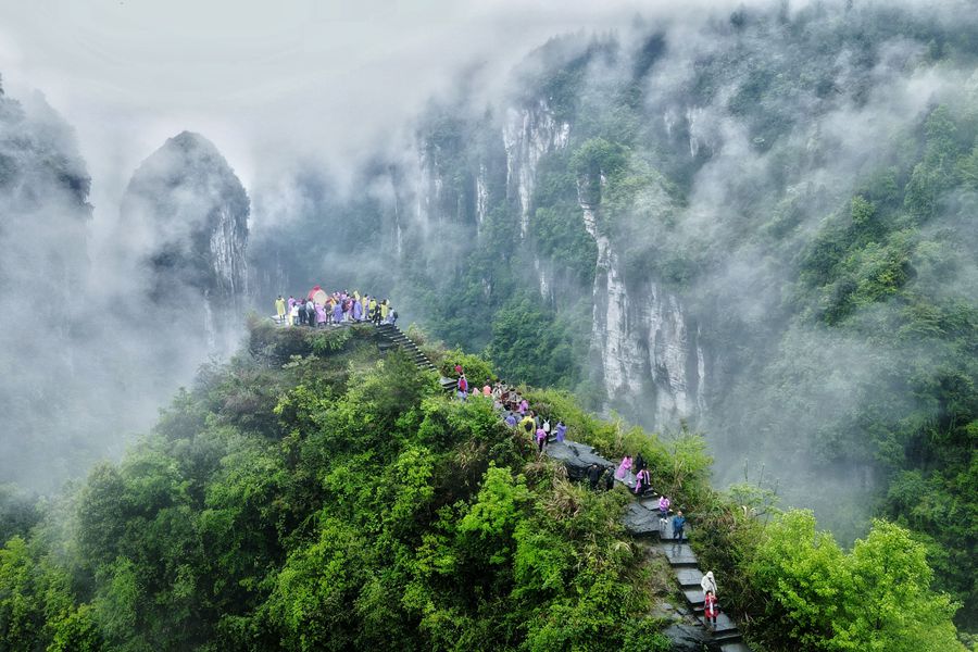 4月20日,吉首市矮寨奇观旅游区天问台,峡谷山峦在云雾中宛如仙境,让游客流连忘返。田源 摄
