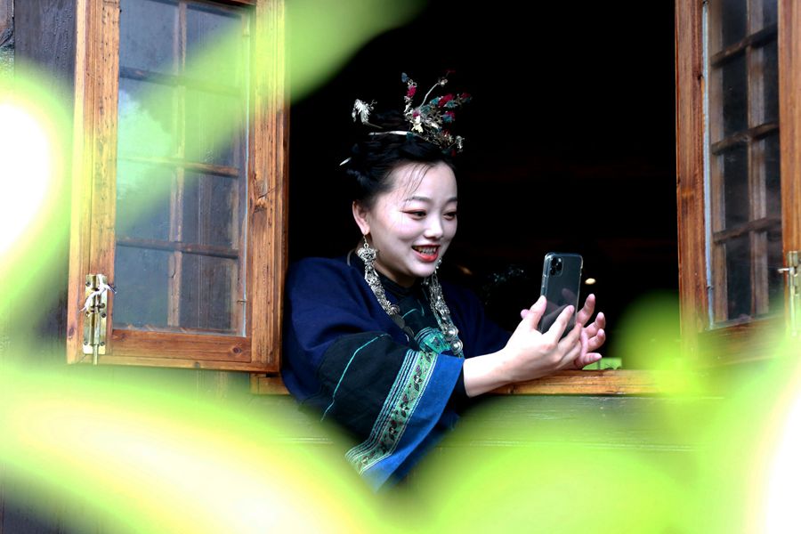 4月20日,吉首市马颈坳镇隘口村,苗族姑娘在进行茶旅网络直播。何嫘 摄