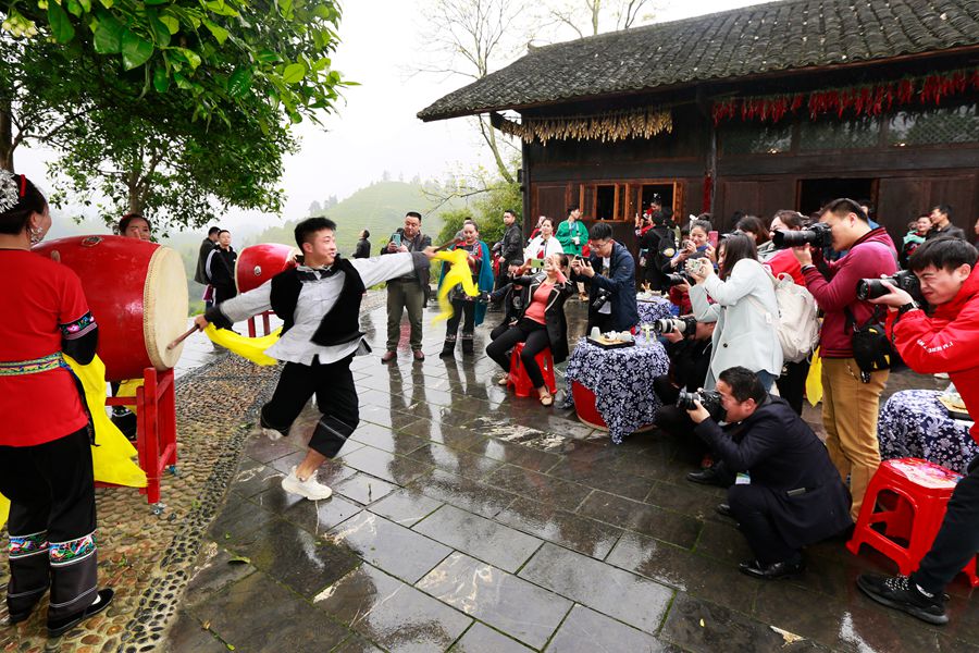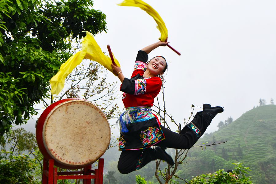 4月20日,吉首市马颈坳镇隘口村,苗鼓表演吸引了众多游客驻足观看。该村于2017年脱贫出列后,积极探索“脱贫攻坚与乡村振兴有机衔接机制”,迈上“以茶促旅、以旅兴茶、以文传茶”的乡村振兴之路。 夏伟雄 摄