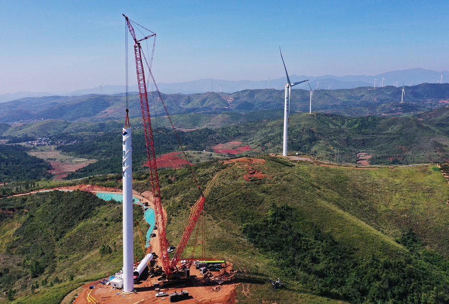 11月6日,桂阳县洋市风电场,施工人员在吊装风力发电机组设备。近年来,该县充分利用高山风力资源优势,大力发展风电产业,推动清洁能源建设,促进当地经济发展。黄春涛 摄(湖南图片库)