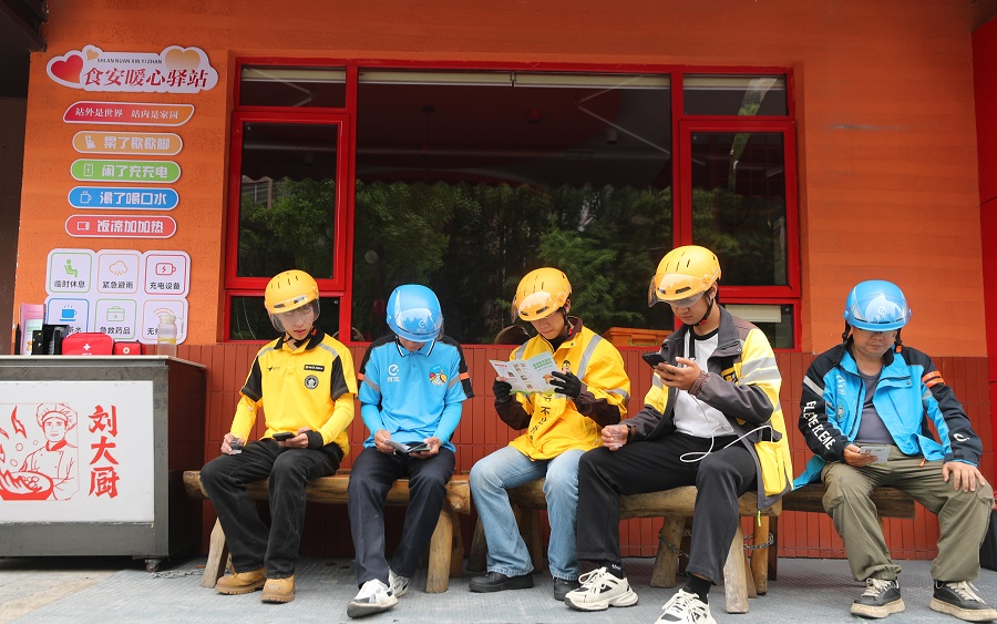 4月25日,衡阳市蒸湘区南华里,外卖骑手在食安暖心驿站小憩。“五一”前夕,蒸湘区委社会工作部联合区市场监督管理局在辖区部分涉及网络订餐的门店打造“食安暖心驿站”。该驿站紧贴网约配送员的工作需求,配备空调、座椅、充电器、饮水设备、医疗箱、微波炉等,供户外工作者临时歇息。曹正平 李尊人 摄影报道