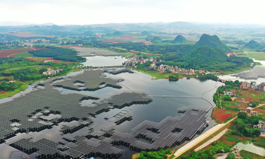 5月8日,嘉禾县广发镇,水上光伏电站与民居、青山相映成趣。近年来,该县采取“渔光互补”“农光互补”“屋顶互补”等多种形式,助力乡村绿色低碳发展。黄春涛 摄