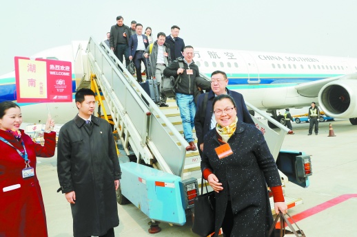 3月2日中午12时30分许,温暖和煦的阳光照进机舱,搭载着部分在湘全国人大代表的南航CZ3717号航班,在北京首都国际机场平稳着陆。