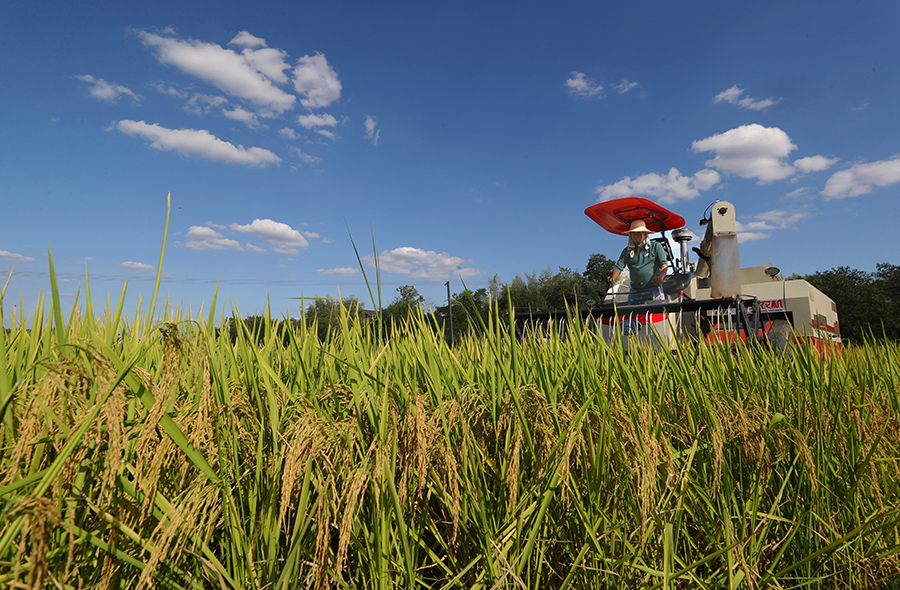 8月21日,衡阳市石鼓区角山镇,村民驾驶农机收割中稻。初秋时节,该镇种植的中稻进入成熟收割季,当地村民战高温,抢收稻谷,确保粮食颗粒归仓。曹正平 李文恋 摄影报道