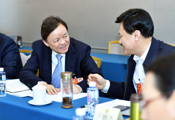 3月5日,王国海委员(左)与同组委员讨论政府工作报告。 湖南日报记者 田超 摄