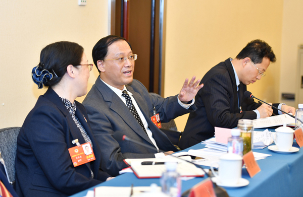 3月5日,杨君武委员(中)与同组委员讨论政府工作报告。 湖南日报记者 田超 摄
