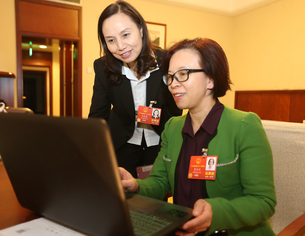 3月5日,胡春莲代表(左)、雷冬竹代表(右)在驻地利用休息时间一起讨论和修改建议。湖南日报记者 赵持 摄