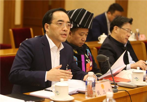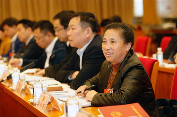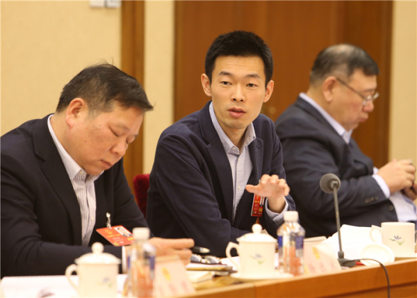 3月12日,秦玥飞代表(中)在审议全国人大常委会工作报告时发言。湖南日报记者 赵持 摄