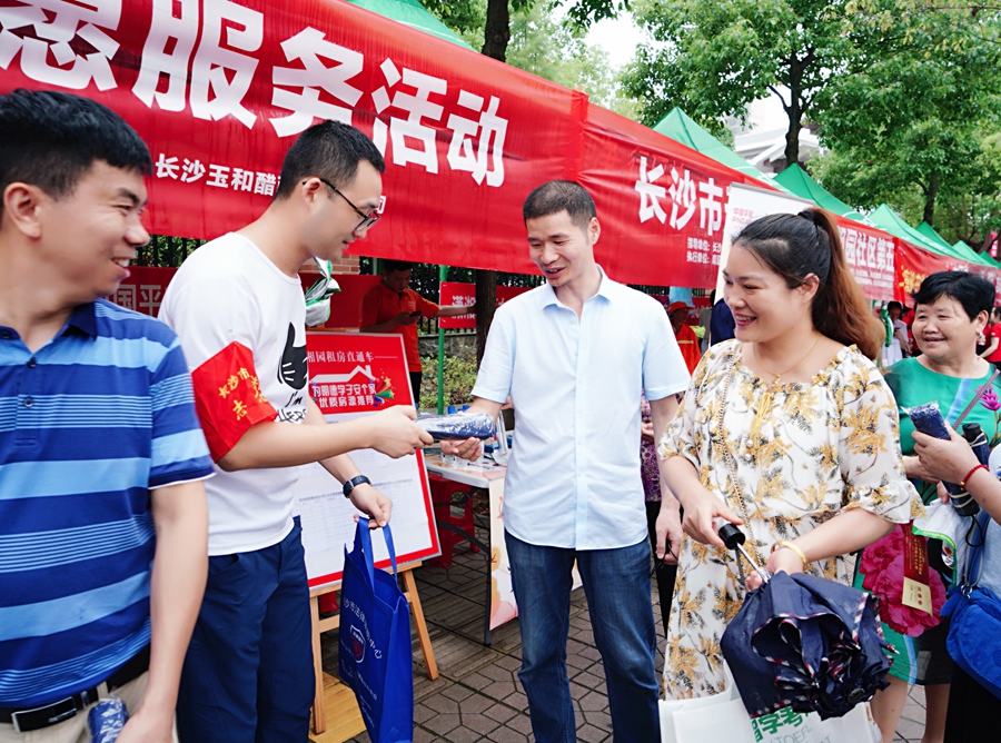 6月7日14时,全国高考长沙市明德中学考点旁,党员志愿者在休息点给考生家长送雨伞。当天,长沙市天心区青园街道湘园社区举办“助力高考·一‘网’直前”主题公益活动。湖南日报记者 徐行 通讯员 徐卫星 摄影报道