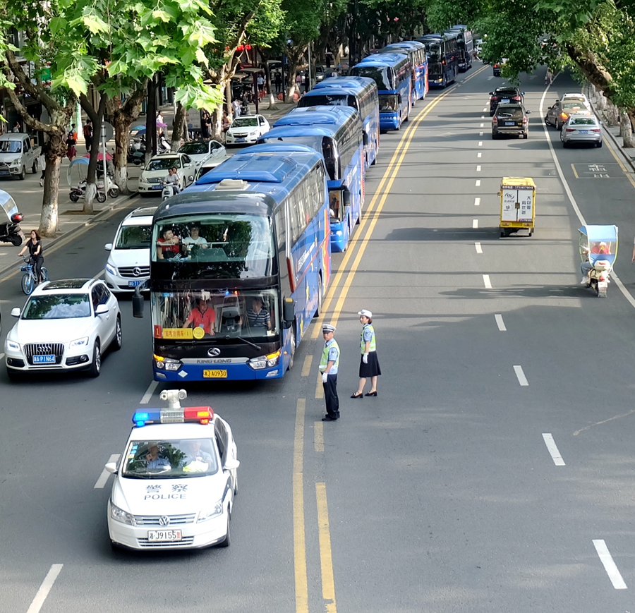高考期间,常德市交警支队组织精干警力为考生打造“绿色通道”。图为6月7日下午考试结束后,送考车队顺利通过常德市朗州路的情景。陈自德 摄
