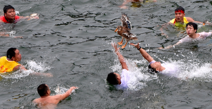 6月17日,花垣县边城古镇清水江水面上,群众在抢鸭子。当天,湖南省花垣县、重庆市秀山县、贵州省松桃县,三县联合在交界地的边城古镇清水江水上举行一年一度的“抢鸭子”、赛龙舟等民俗活动,欢乐迎端午。龙恩泽 摄