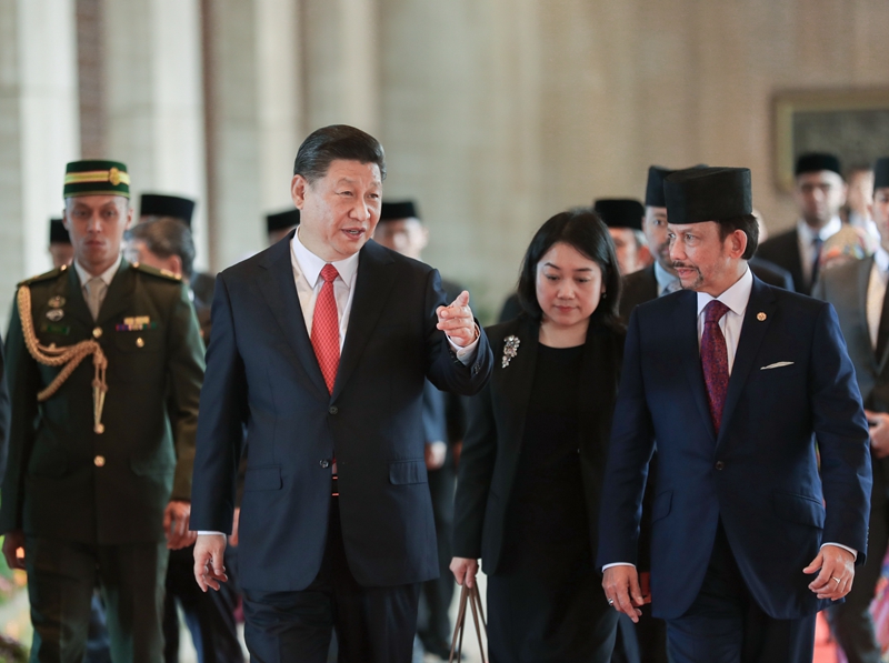习近平抵达王宫时,哈桑纳尔在停车处热情迎接。两国元首登上检阅台。仪仗队行礼,军乐队奏中文两国国歌。现场鸣放21响礼炮。在哈桑纳尔陪同下,习近平检阅仪仗队。检阅毕,两国元首前往王宫内廷。习近平同文莱王室成员、主要官员及各国驻文莱使节握手。哈桑纳尔同中方陪同人员握手。