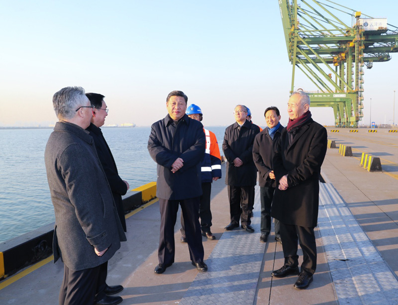 1月16日至18日,中共中央总书记、国家主席、中央军委主席习近平在京津冀考察,主持召开京津冀协同发展座谈会并发表重要讲话。这是1月17日下午,习近平在天津港码头考察。新华社记者 鞠鹏 摄