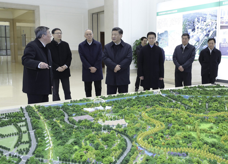 18日上午,习近平乘车前往北京城市副中心,并沿途察看“城市绿心”植树造林地块。在市委办公楼主楼,习近平通过设计模型和展板,详细了解副中心重大工程项目规划建设情况。习近平强调,建设北京城市副中心要坚持规划先行、质量第一。要把公共建筑与山水自然融为一体,科学布局生产、生活、生态空间,使工作、居住、休闲、交通、教育、医疗等有机衔接、便利快捷。要把规划执行好、落实好,把蓝图变为实景,使北京城市副中心成为这座千年古都又一张靓丽的城市名片。