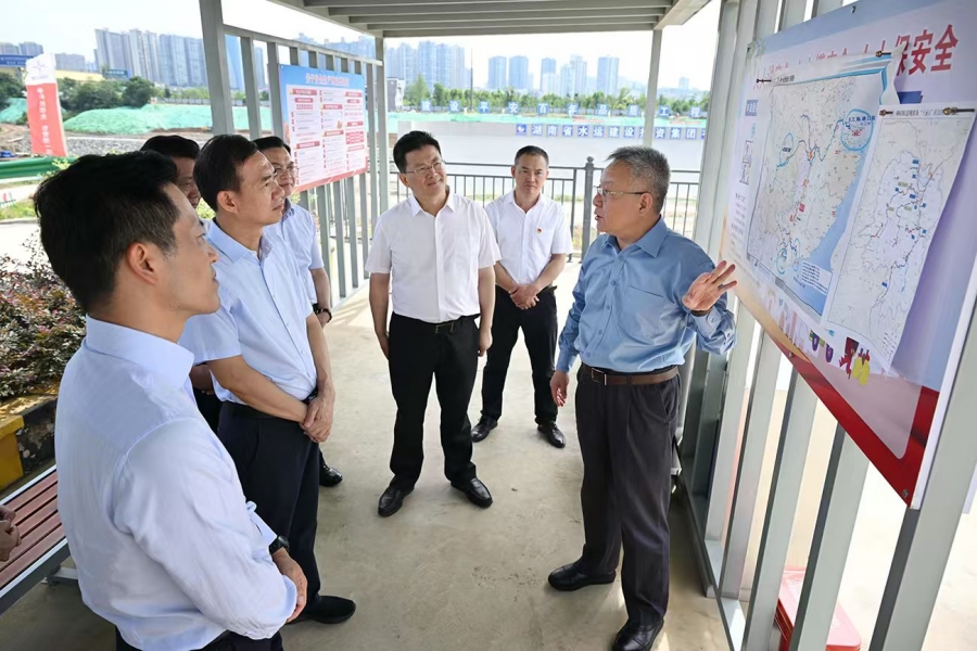 6月16日,沈晓明来到湘江永州至衡阳三级航道潇湘船闸项目建设现场调研。