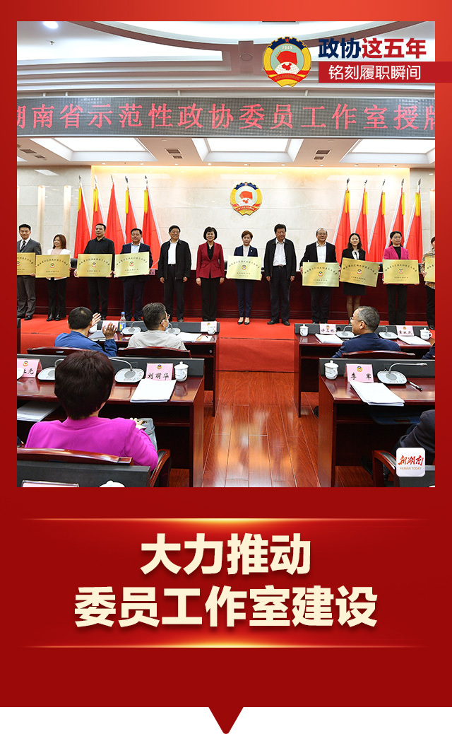 2020年11月18日,省政协举行湖南省示范性政协委员工作室授牌仪式,为示范性政协委员工作室代表授牌。省、市、县三级共有100个政协委员工作室入列。如今,这些建在群众身边的委员工作室已成为湖南政协委员联系服务群众的新平台,畅通社情民意的新载体。