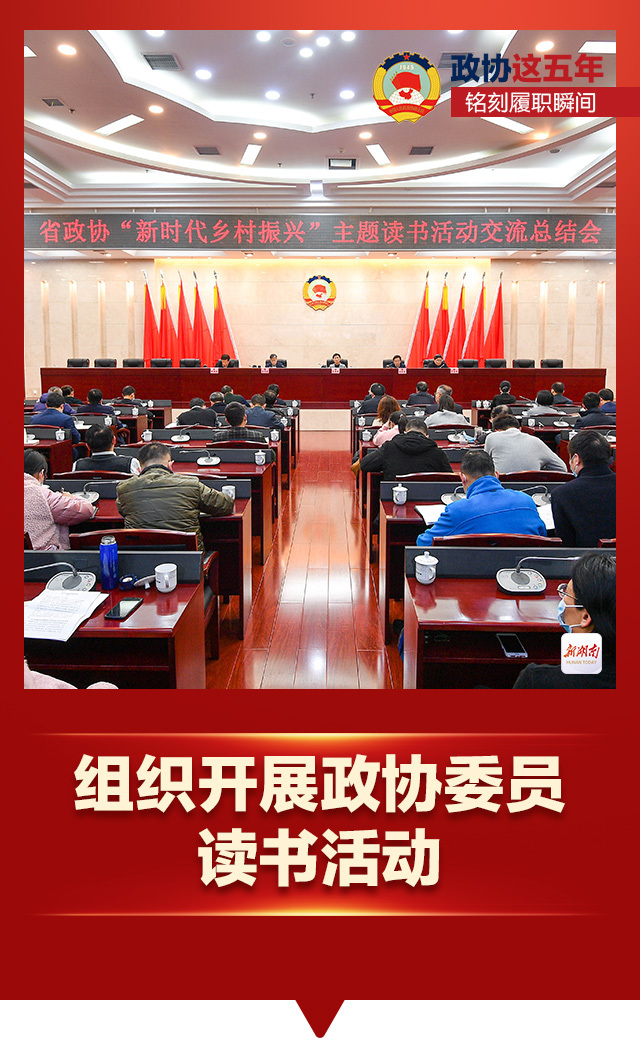 2020年8月,省政协首次组织开展政协委员读书活动。先后在全国政协书院开展“新时代乡村振兴”“百年湖湘潮”“潇湘新咏”三期读书活动和一期“湖南主题周”读书活动。开设政协云书院,以“书香政协”促进“书香湖南”建设。
