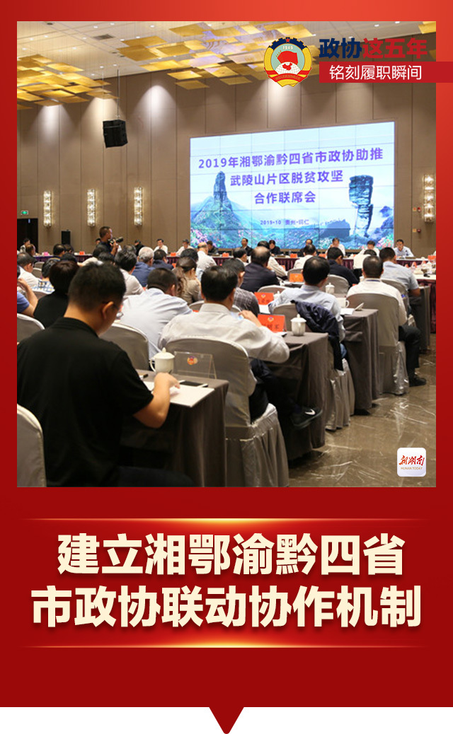 2018年10月30日至31日,湘鄂渝黔四省市政协助推武陵山片区旅游产业扶贫合作座谈会在湘西土家族苗族自治州召开,建立了湘鄂渝黔四省市政协联动协作机制。多年来,通过这一联动协作机制,湘鄂渝黔四省市政协组织各方深入协商交流,助推武陵山片区脱贫攻坚跑出“加速度”、乡村振兴进入“快车道”。