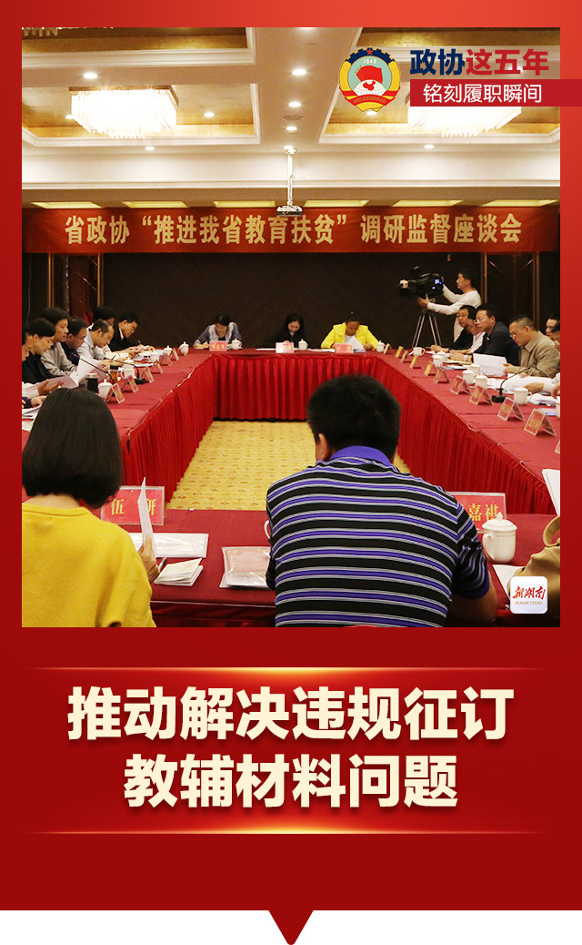 2017年4月,省政协主席李微微带队赴永州市开展教育扶贫调研协商监督。在调研过程中,发现了中小学教辅材收费问题。与此同时,省政协调研监督组向省直有关部门反映了情况,在多方共同努力下,违规征订教辅材料的问题得以解决。