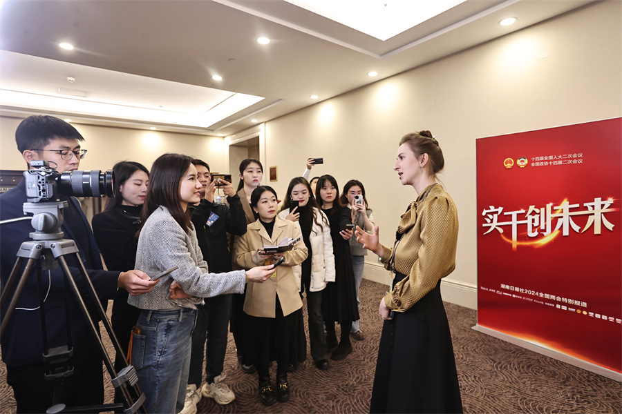 3月7日上午,湖南日报等媒体采访受邀参加湖南代表团开放团组会议的迪拜中阿卫视记者蔼霖娜。 湖南日报全媒体记者 刘尚文 摄