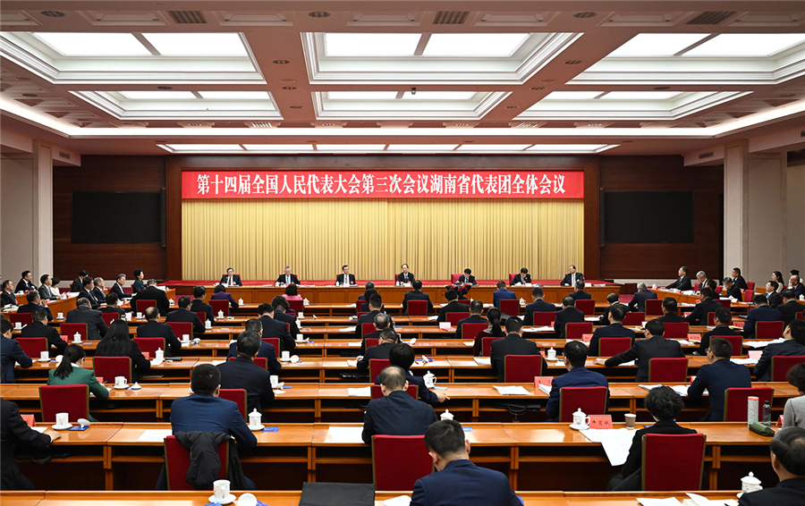3月5日,出席十四届全国人大三次会议的湖南代表团在驻地举行第二次全体会议,审议政府工作报告。中共中央政治局委员、中央统战部部长石泰峰,全国人大常委会副委员长、农工党中央主席何维,全国人大常委会副委员长张庆伟参加审议。