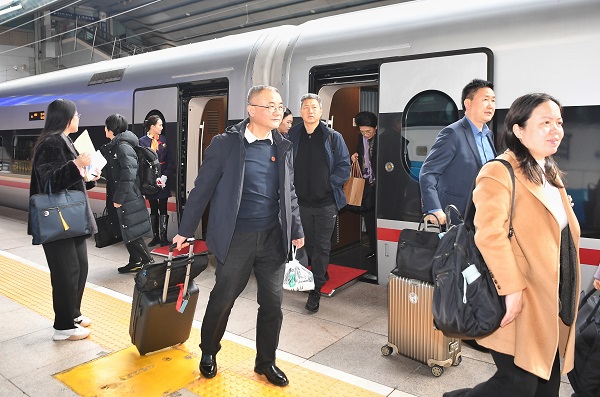 3月3日下午,出席十四届全国人大三次会议的部分在湘全国人大代表乘高铁抵达北京,向大会报到。 湖南日报全媒体记者 唐俊 傅聪 易昂 摄