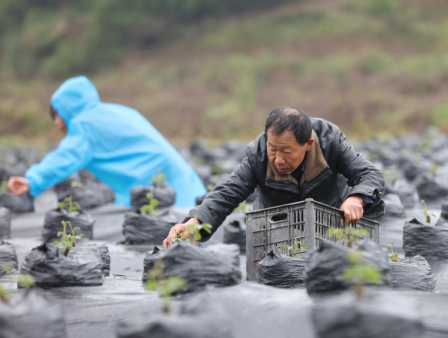 3月29日,张家界市武陵源区协合乡菜葛种植基地,葛农在对葛苗进行管理。菜葛种植是武陵源区旅游扶贫的产业示范项目,种植面积超过3000亩,通过发展规模化菜葛种植及深加工产业,带动当地农民增收致富。吴勇兵 摄