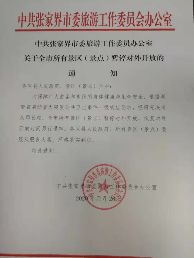 《通知》中称,根据湖南省启动重大突发公共卫生事件一级响应的要求,为保障广大游客和市民身体健康与生命安全,自2020年1月26日上午8时起,张家界全市所有景区(景点)暂停对外开放,恢复对外开放时间另行通知。