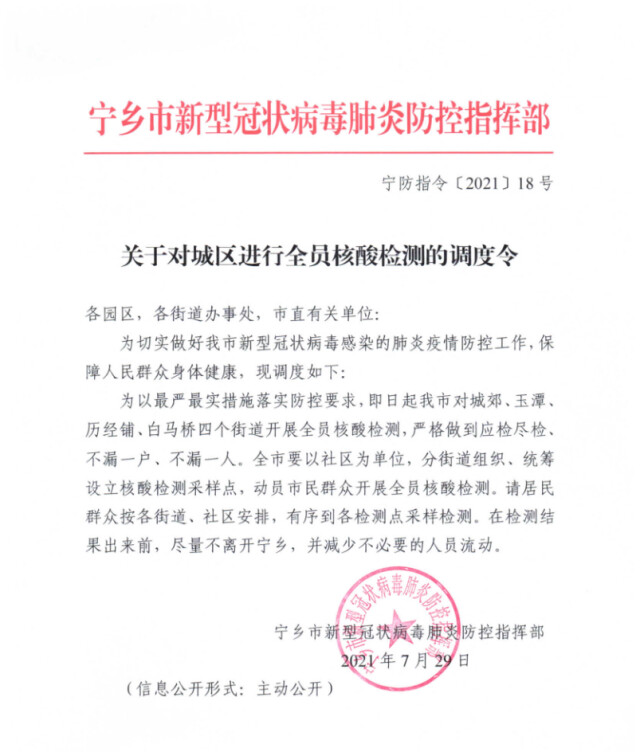 7月29日,宁乡市新型冠状病毒肺炎防控指挥部发布调令,即日起对宁乡市城郊、玉潭、历经铺、白马桥四个街道开展全员核酸检测。