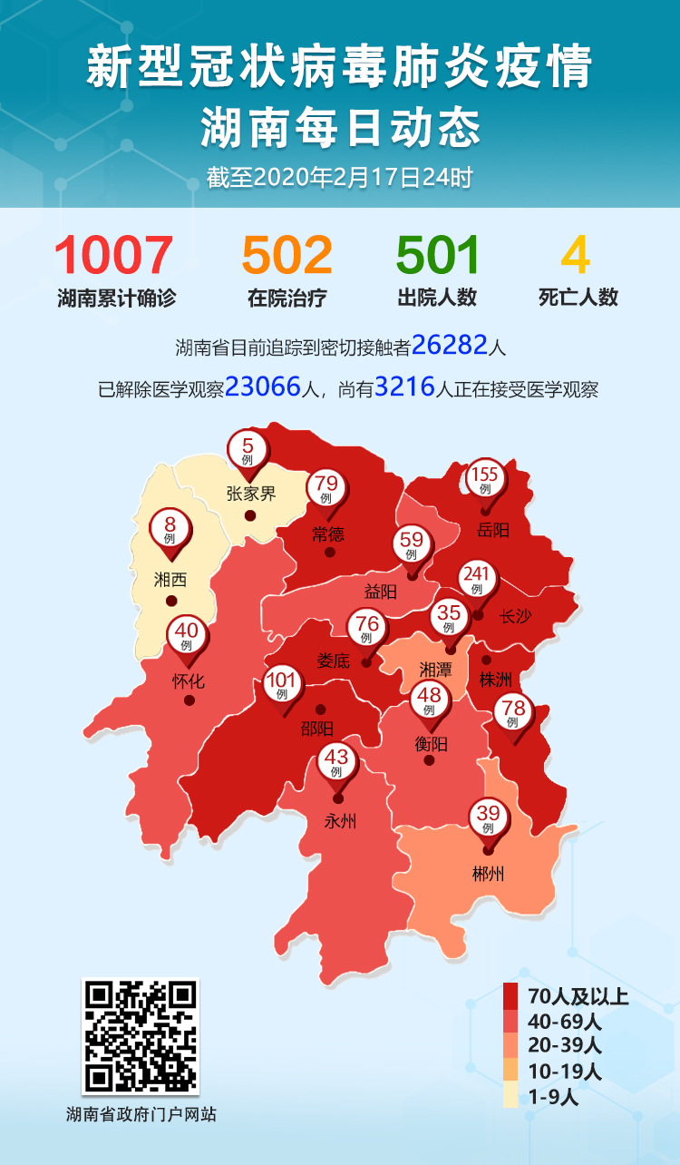 截至2月17日24时,湖南省累计报告新型冠状病毒肺炎确诊病例1007例,累计报告重症病例138例,现有重症病例47例,死亡病例4例,出院病例501例,在院治疗502例。其中: