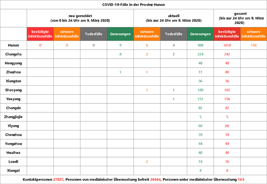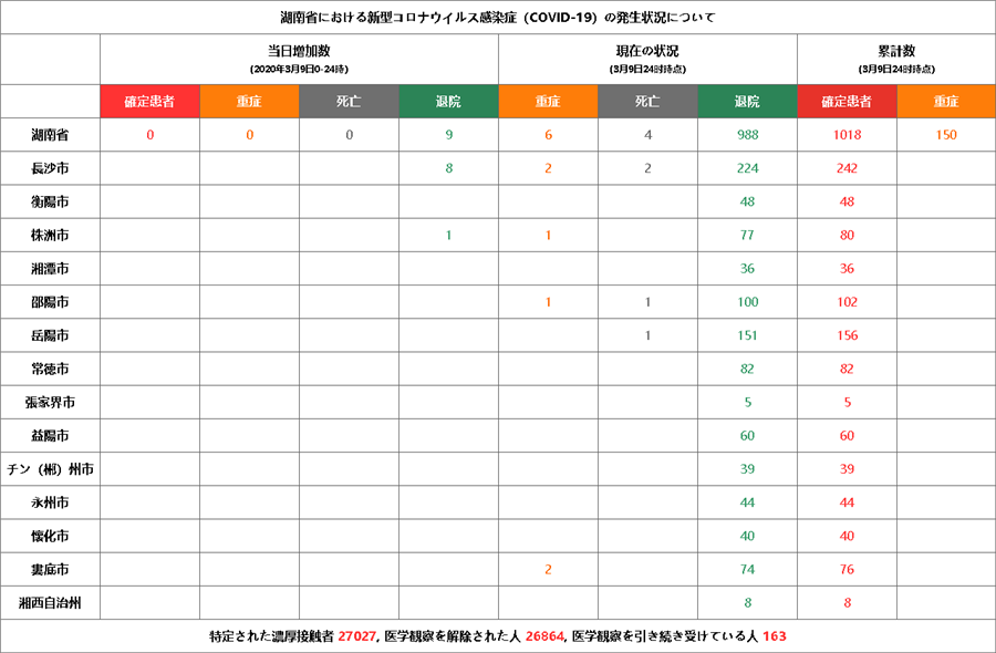 湖南省新型冠状病毒肺炎疫情信息(截至3月9日24时)