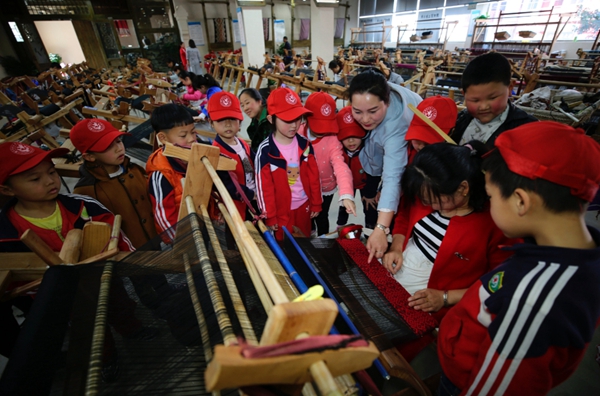 4月9日,张家界市武陵源区乖幺妹土家族织锦基地,小学生在了解土家族织锦工艺流程。近年,该区通过政府支持、企业参与、学校引导等方式,将土家族织锦“非遗”项目拓展为学生“校外课堂”实践内容,培养学生热爱、学习非物质文化遗产的兴趣,拓宽视野,丰富知识。