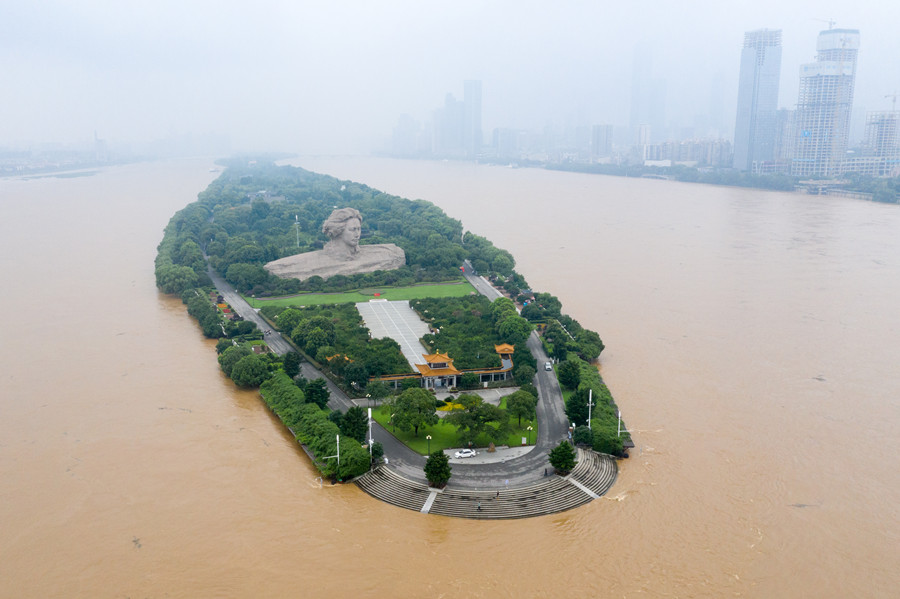 7月9日,长沙市橘子洲景区环洲亲水平台已被江水淹没。当天20时,湘江长沙站水位上涨至37.06米,超警戒水位1.06米。 傅聪 李健 摄影报道