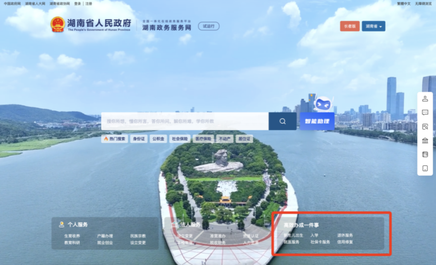 进入“湖南省政务服务网”,选择点击“高效办成一件事”专区,进入个人创业“一件事”办理页面。