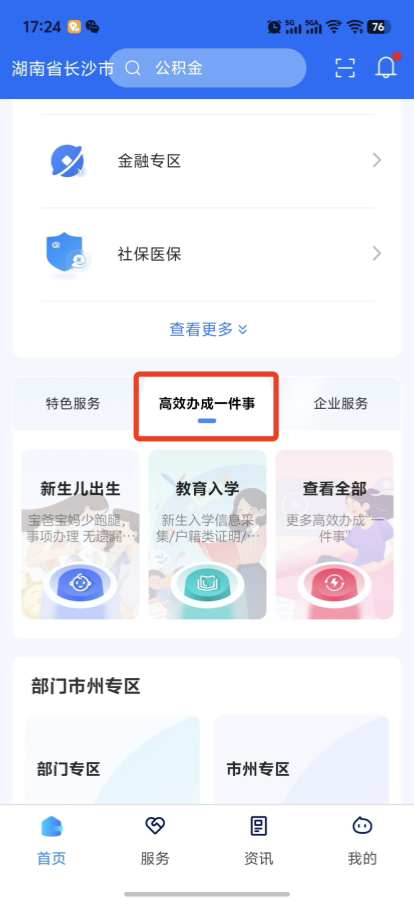 进入湘易办app或者小程序,选择点击“高效办成一件事”专区,进入个人创业“一件事”办理页面。