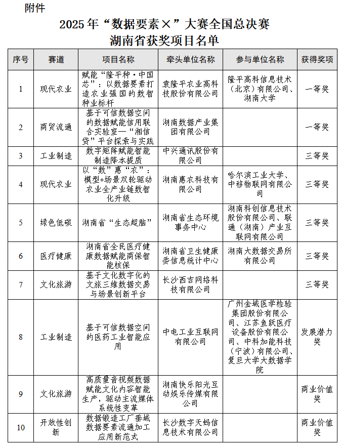 10月29日,国家数据局公布了2025年“数据要素×”大赛全国总决赛获奖项目名单,湖南共有10个项目获奖,其中2个项目获一等奖、5个项目获三等奖、1个项目获发展潜力奖、2个项目获商业价值奖,获一等奖项目数居全国第二、中部省份第一。