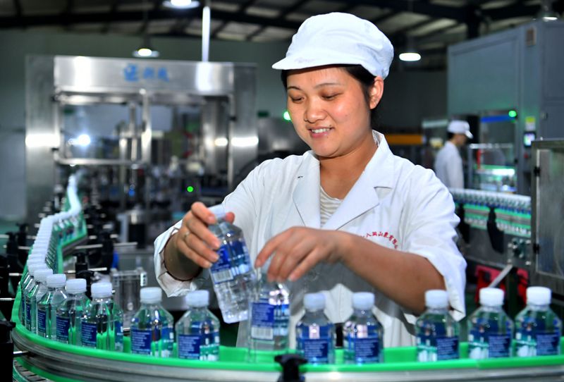 2018年10月28日,花垣县十八洞村山泉水厂,村民在流水线上忙碌。今年,该村与步步高集团合作创办山泉水厂,企业每年给村集体保底分红50万元,每生产一瓶水再提取1分钱作为村扶贫基金。
