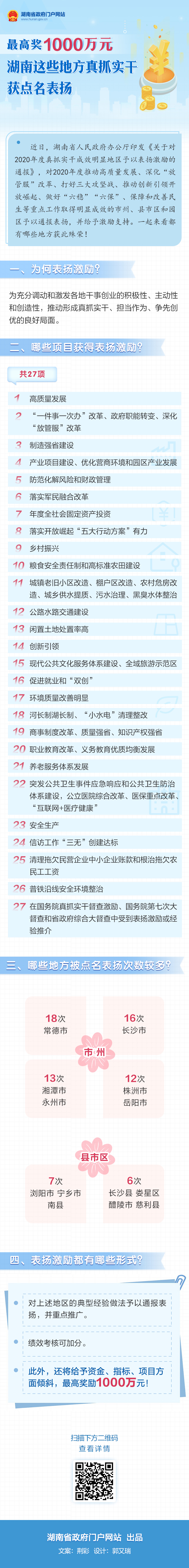 近日,湖南省人民政府办公厅印发《关于对2020年度真抓实干成效明显地区予以表扬激励的通报》,对2020年度推动高质量发展、深化“放管服”改革、打好三大攻坚战、推动创新引领开放崛起、做好“六稳”“六保”、保障和改善民生等重点工作取得明显成效的市州、县市区和园区予以通报表扬,并给予激励支持。一起来看都有哪些地方获此殊荣?