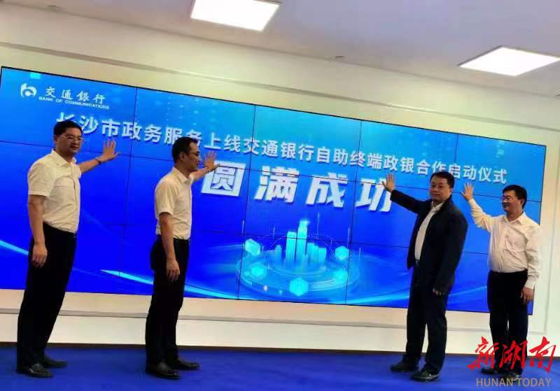 9月25日,长沙市政务服务上线交通银行自助终端启动仪式在交通银行湖南省分行举行。此次政银合作,标志着长沙首次将“政务大厅”搬进银行网点,为办事企业、群众提供“政务+金融”双项业务通办的新服务模式。