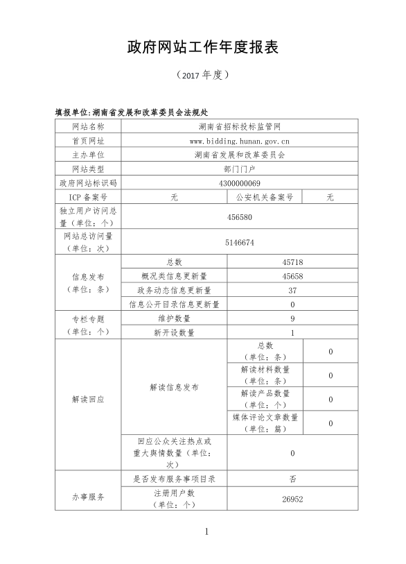 2017年湖南省招标投标监管网政府网站工作年度报表