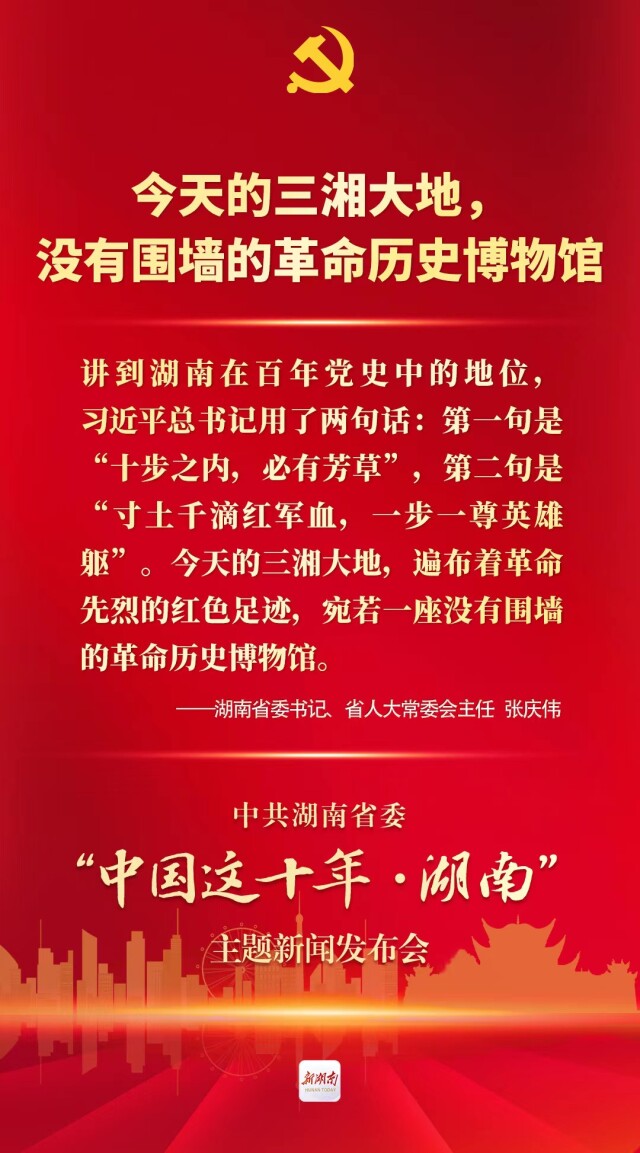 8月5日10时,“中国这十年·湖南”主题新闻发布会在长沙举行。记者从发布会上获悉,目前,湖南拥有省级以上爱国主义教育基地192个、不可移动革命文物2300余处,革命文物资源总量和重要革命文物数量居全国前列。今天的三湘大地,遍布着革命先烈的红色足迹,宛若一座没有围墙的革命历史博物馆。