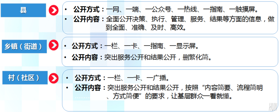 二是区别“三个层级”,分级分类公开。为增强公开实效,结合基层实际,我们提出区别县、乡、村“三个层级”,从公开内容和方式上分级分类公开。
