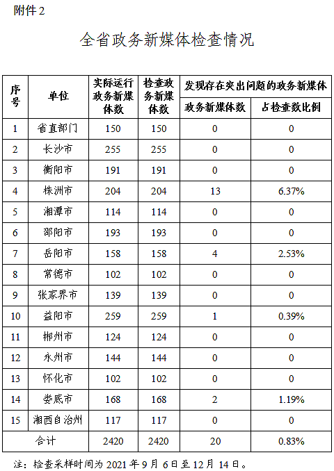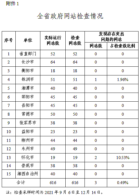 2021年第四季度,省政务管理服务局组织对全省正常运行的616家政府网站进行全覆盖检查,发现3家存在单项否决问题,总体检查合格率99.51%。对全省正常运行的2420家政务新媒体进行普查,发现20家存在单项否决问题,总体合格率99.17%,其中长沙市、衡阳市、湘潭市、邵阳市、常德市、张家界市、郴州市、永州市、湘西自治州政府网站与政务新媒体检查合格率均达到100%。