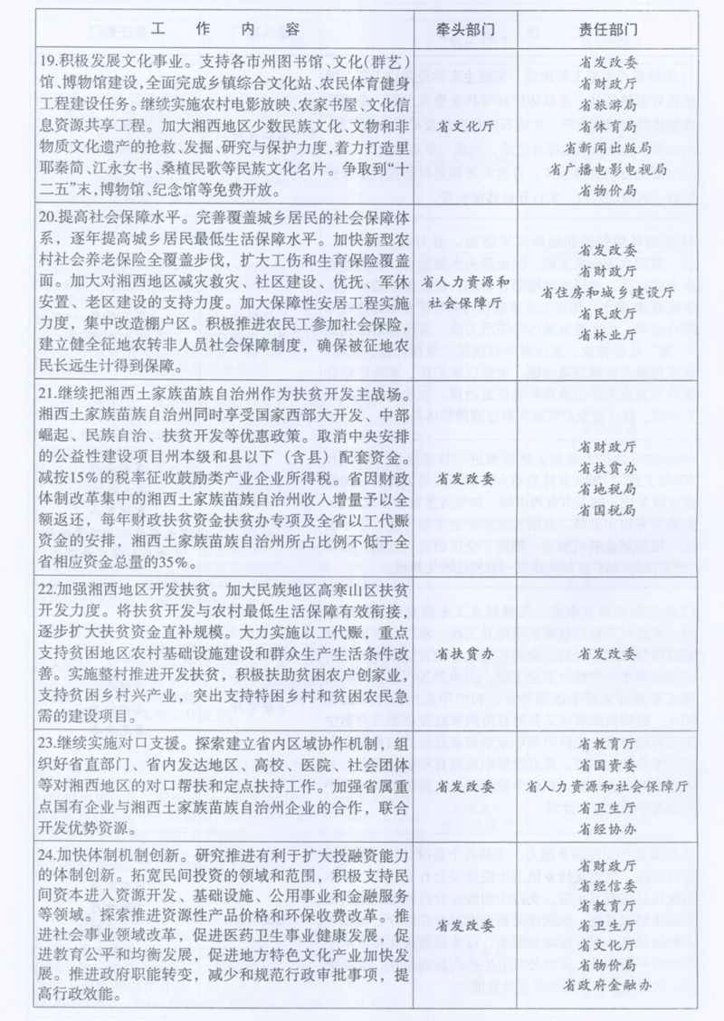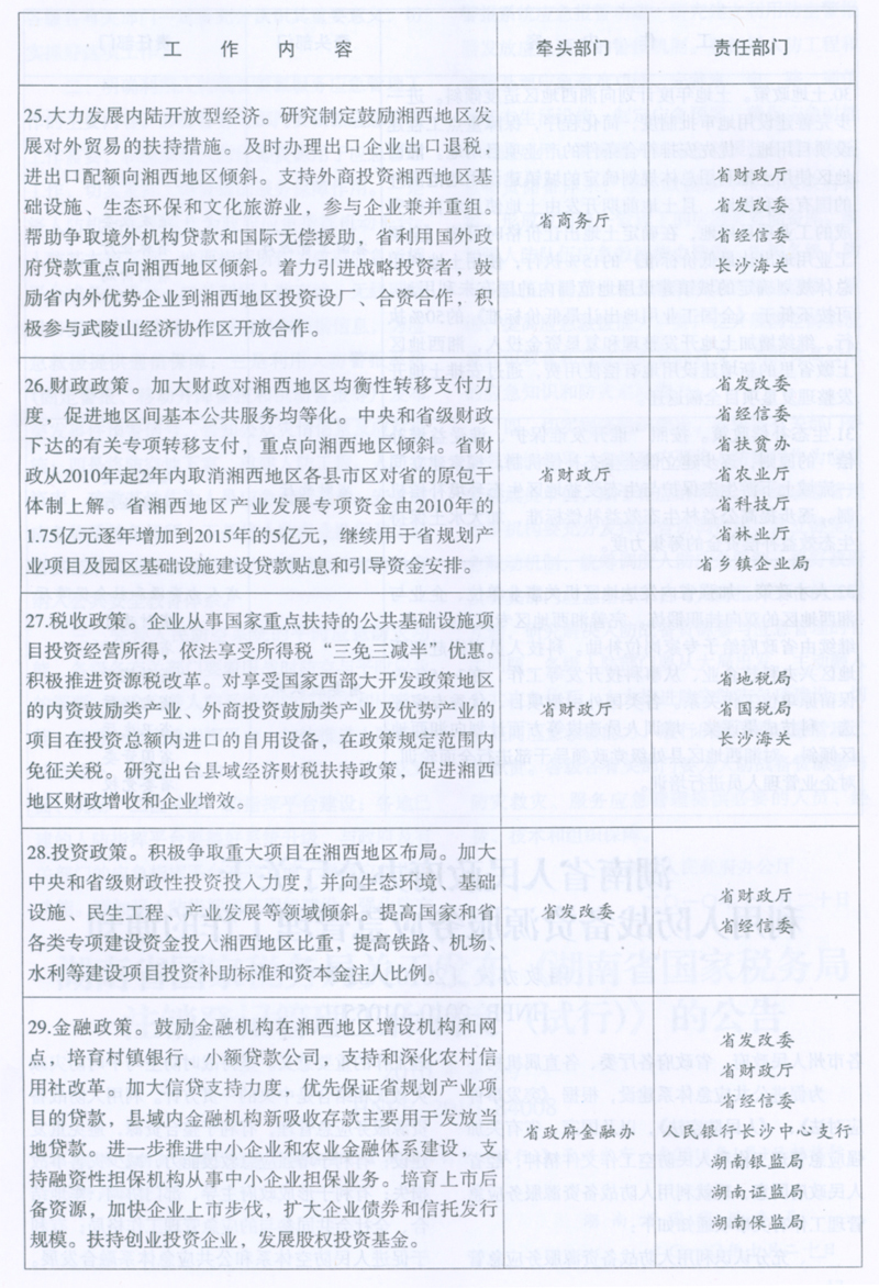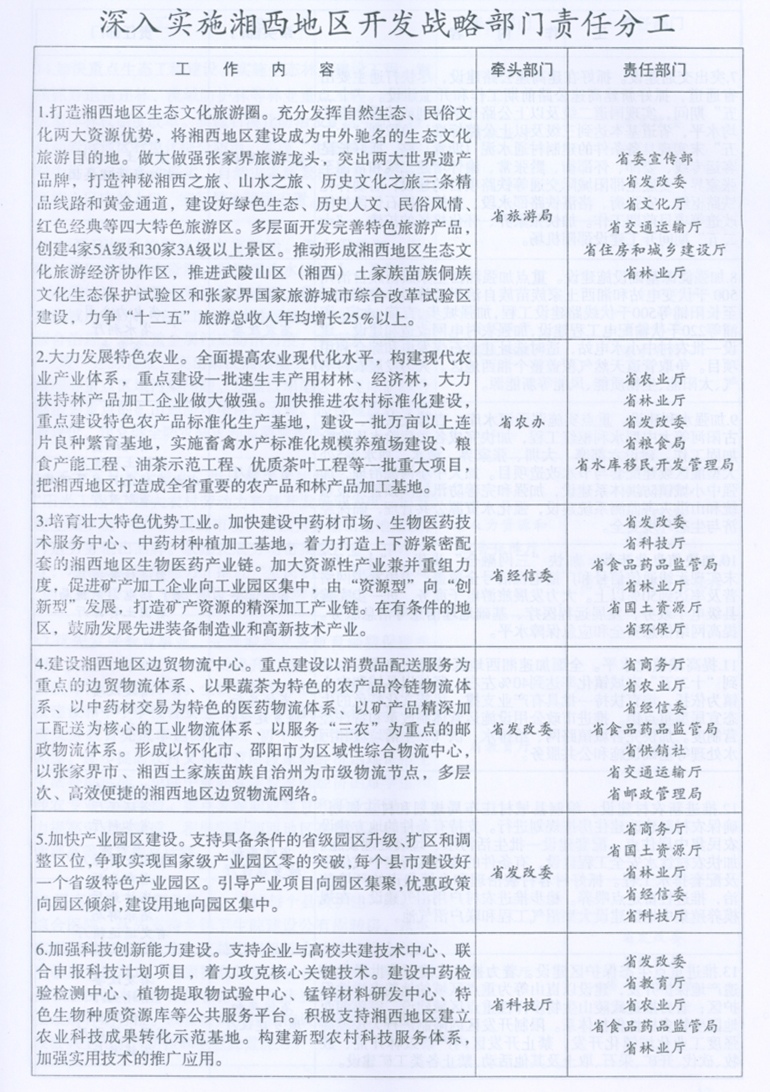 《深入实施湘西地区开发战略部门责任分工》已经省委、省人民政府同意,现印发给你们,请各责任单位加强组织领导,明确工作责任,认真抓好落实。