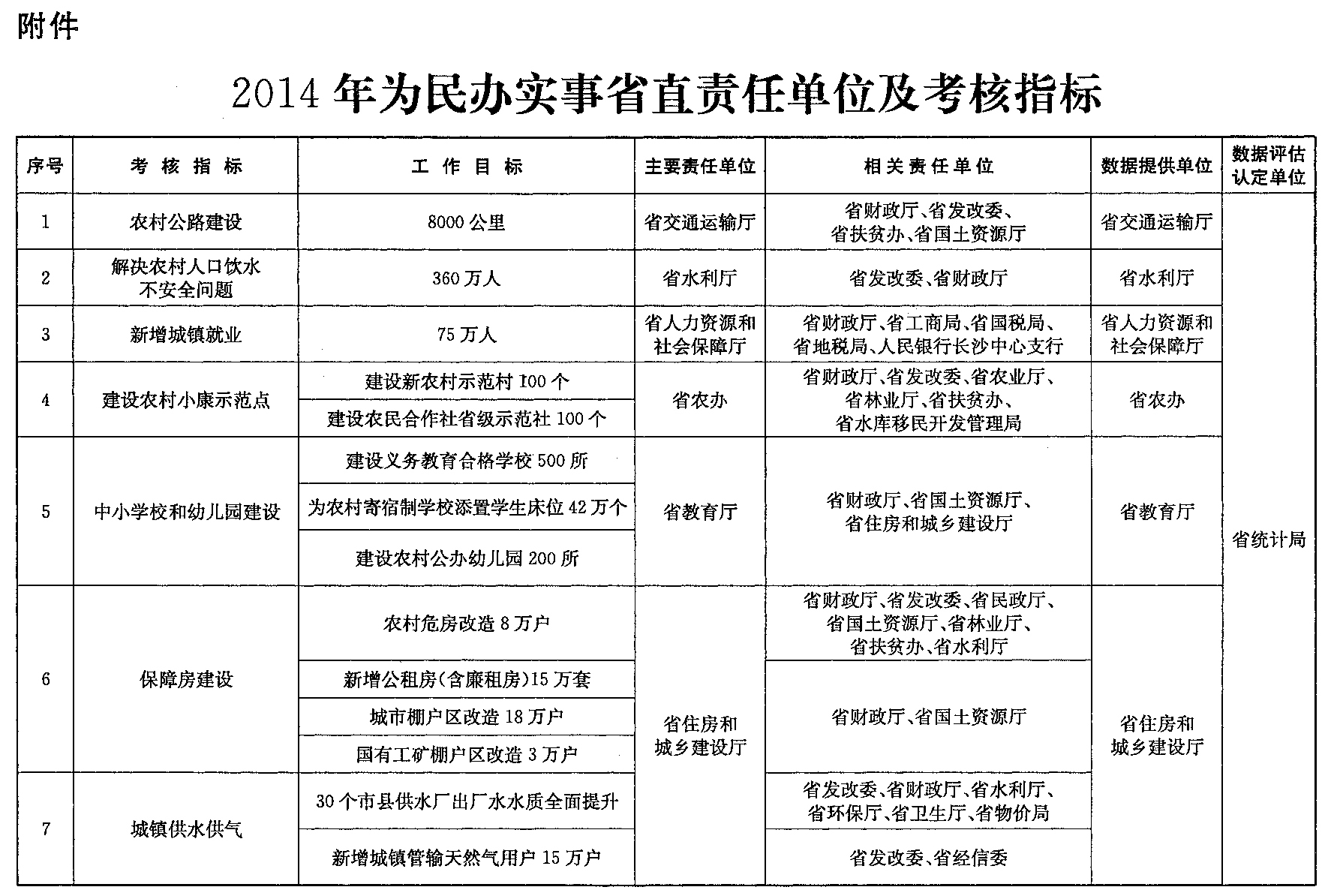 1.对27个省直责任单位的考核指标:将为民办实事15个考核指标任务落实到有关省直责任单位,具体考核验收标准由省统计局商有关单位制定。27个省直责任单位完成考核指标的数据由省统计局评估认定。
