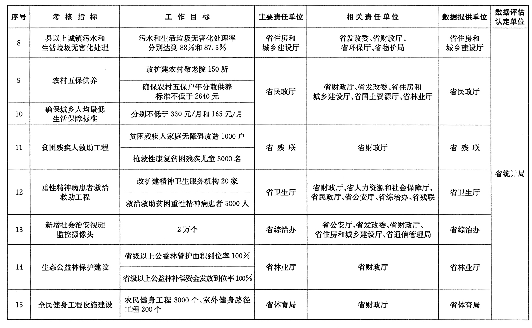 2.对14个市州人民政府的考核指标:由各项目主要责任单位结合实际,将任务分解落实到市州。市州人民政府完成考核指标的数据,分别由各项目主要责任单位初评后,报省统计局评估认定。