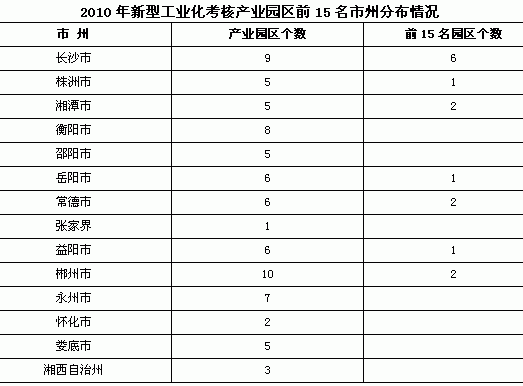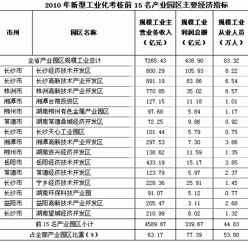 (五)结构调整优化,节能减排扎实推进。2010年,全省产业园区六大高耗能行业实现规模工业增加值576.94亿元,占产业园区规模工业增加值的26.0%,比全省平均水平低8.9个百分点。产业园区万元规模工业增加值能耗同比下降15.66%,比全省单位规模工业增加值能耗多下降3.72个百分点。工业企业主要污染物排放总量减少,45个产业园区二氧化硫削减率高于全省平均水平。其中,长沙高新技术产业开发区、岳阳经济技术开发区的二氧化硫削减率,比全省平均水平高出30个百分点以上;株洲高新技术产业开发区、宁乡经济技术开发区、湖南资兴经济开发区和湖南环保科技产业园的二氧化硫削减率,比全省平均水平高出20个百分点以上。