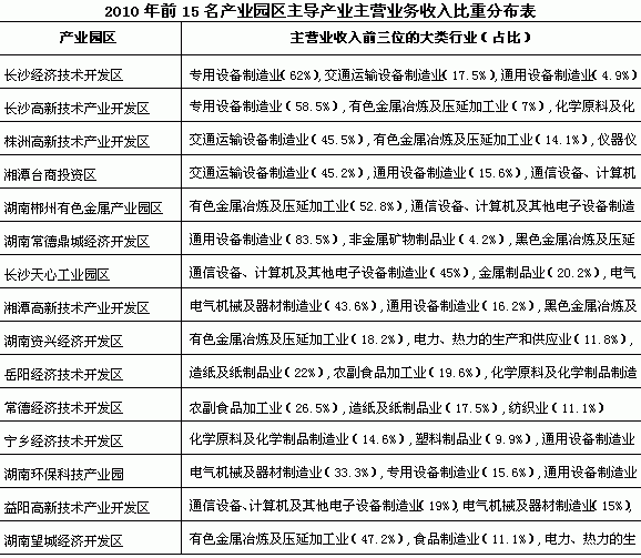 从各产业园区发展布局来看,新型工业化考核前15名产业园区主导产业专业化分工特色明显,15个产业园区中有10个园区主导产业主营业务收入占其园区主营业务收入比重在30%以上。湖南常德鼎城经济开发区通用设备制造业实现主营业务收入占其园区比重达83.5%,长沙经济技术开发区、长沙高新技术产业开发区以工程机械为代表的专用设备制造业主营业务收入占其园区比重分别为62.0%和58.5%,湖南郴州有色金属产业园区有色金属冶炼及压延加工业主营业务收入占其园区比重52.8%,株洲高新技术产业开发区、湘潭台商投资区以轨道交通和汽车为代表的交通运输设备制造业主营业务收入占其园区比重分别为45.5%和45.2%。